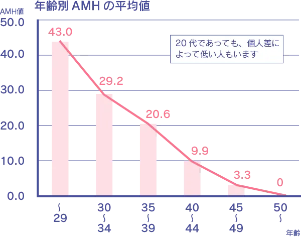 一般に20代前半~20代半ばでAMHはピークに近い値を示し、その後はゆるやかに下降し、35歳前後から低下のスピードが速まると言われます。