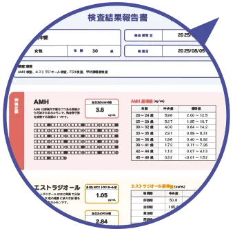 AMHは卵巣内で育ちつつある卵胞から分泌されるホルモンで、その濃度によって卵巣に残っている卵子の数(卵巣予備能)の目安がわかります。
