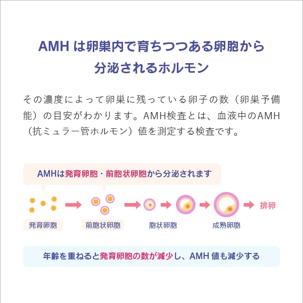AMHは卵巣内で育ちつつある卵胞から分泌されるホルモンで、その濃度によって卵巣に残っている卵子の数(卵巣予備能)の目安がわかります。