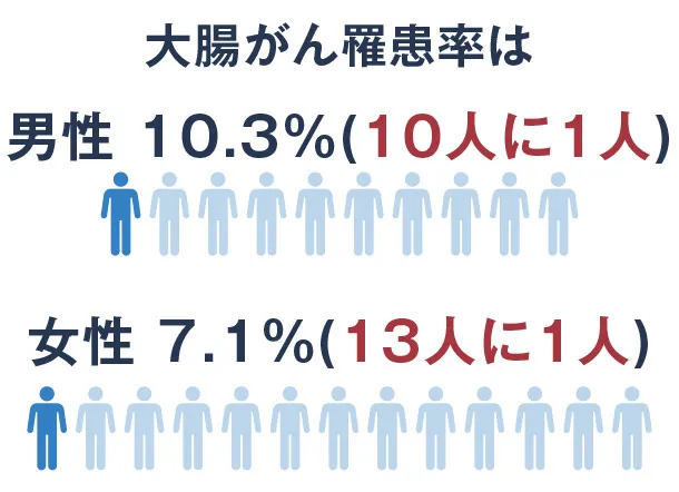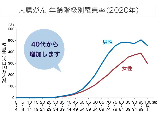 大腸がんは日本で最も多く、男女とも40歳代から増え始め、年齢を追うごとに罹患率が高まります。増加の背景は、食生活の欧米化に伴う動物性タンパク質や脂肪分の摂りすぎ、運動不足、肥満、喫煙、飲酒などが挙げられます。